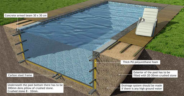 Durch die selbsttragende Konstruktion haben Sie den Vorteil, das Becken auch bei besonderem Gelände mit Gefälle oder auch freistehend als Skimmer, Überlauf- oder Infinity-Becken, zu bauen.