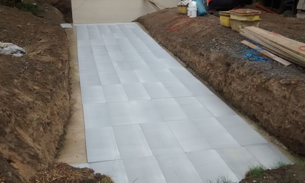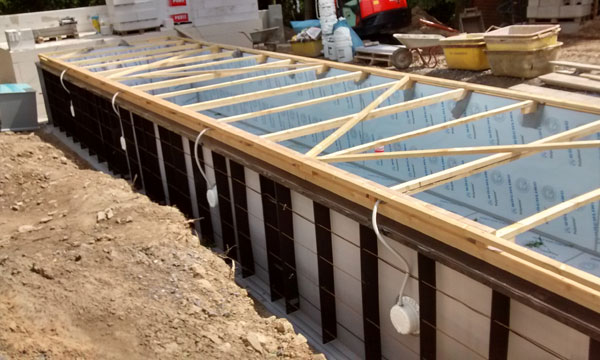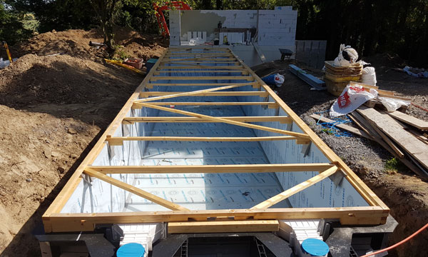Die Baugrube ist ausgehoben, die stahlbewehrte Betonbodenplatte fertiggestellt. Vor dem Aufsetzen des Beckenkörpers wird die Bodenfläche mit Styrodurplatten ausgelegt. Dadurch wird der Beckenboden isoliert, geschützt und mechanische Beschädigungen werden vermieden.