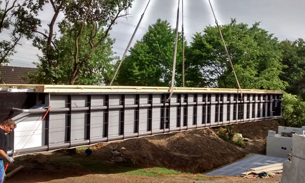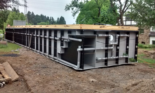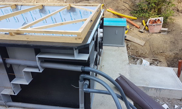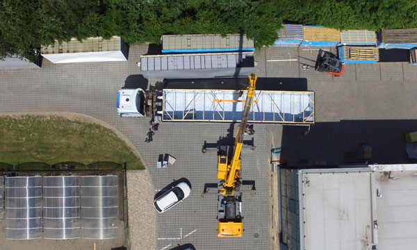 Das Becken ist auf der Baustelle angekommen. Die werkseitig geprüfte und isolierte Verrohrung ist vollständig in die Rippenrahmen-Konstruktion integriert.