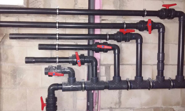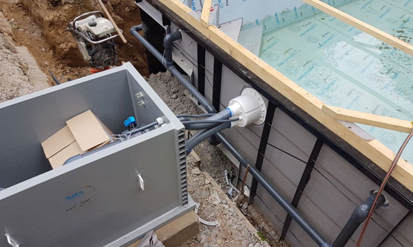 Die Verrohrung am Übergabepunkt zwischen Becken und Technikraum ist fertiggestellt.