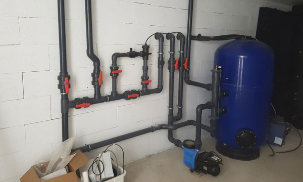 Installation der Filter- und Desinfektionstechnik. Eingesetzt werden ein Mehrschichtfilterbehälter sowie eine drehzahlgeregelte Pumpe für eine energieeffiziente Beckenhydraulik.