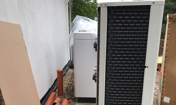 Die Luftwärmepumpe steht auf einem eigenen Betonfundament. Sie ist so ausgelegt, dass auch bei dauerhaftem Betrieb eine angenehme Wassertemperatur im Winter möglich ist.