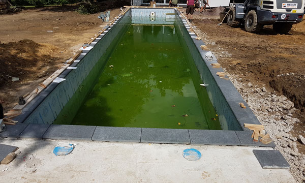 Nach Herstellung des Betonrähms werden die Beckenrandsteine aus Granit verlegt. Da das Becken ca. 30 cm aus dem Gelände herausragt, werden die sichtbaren Seitenflächen ebenfalls mit dem gleichen Material verkleidet.