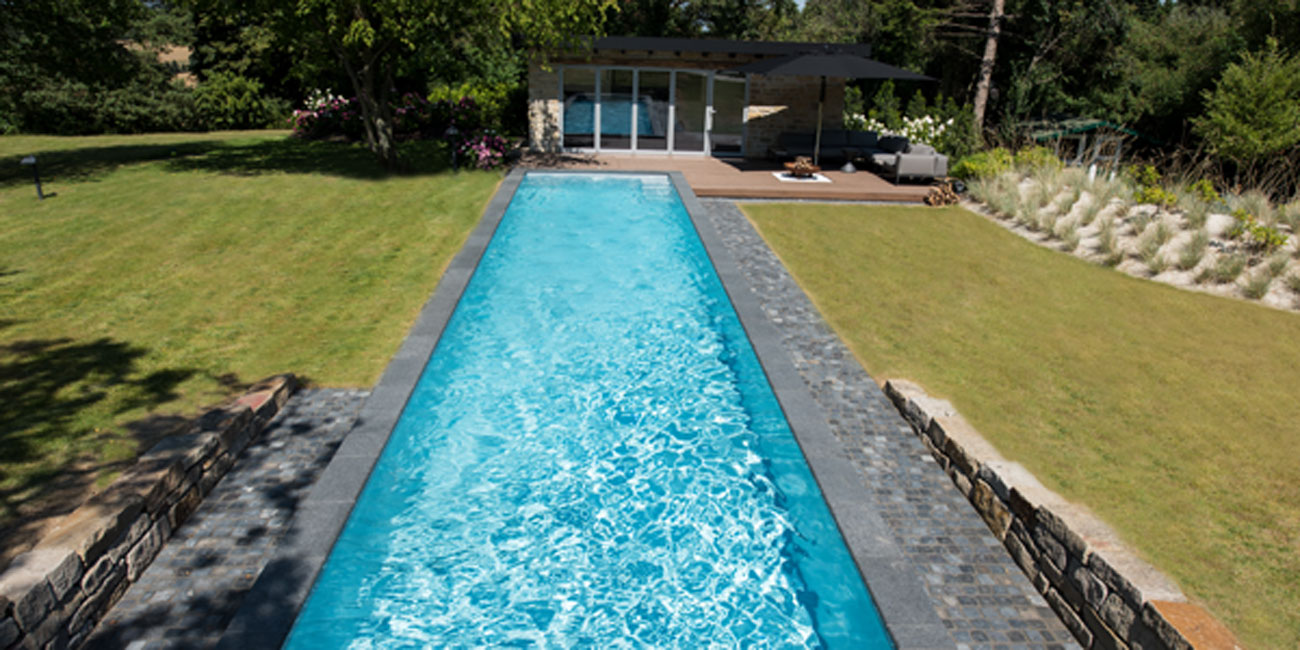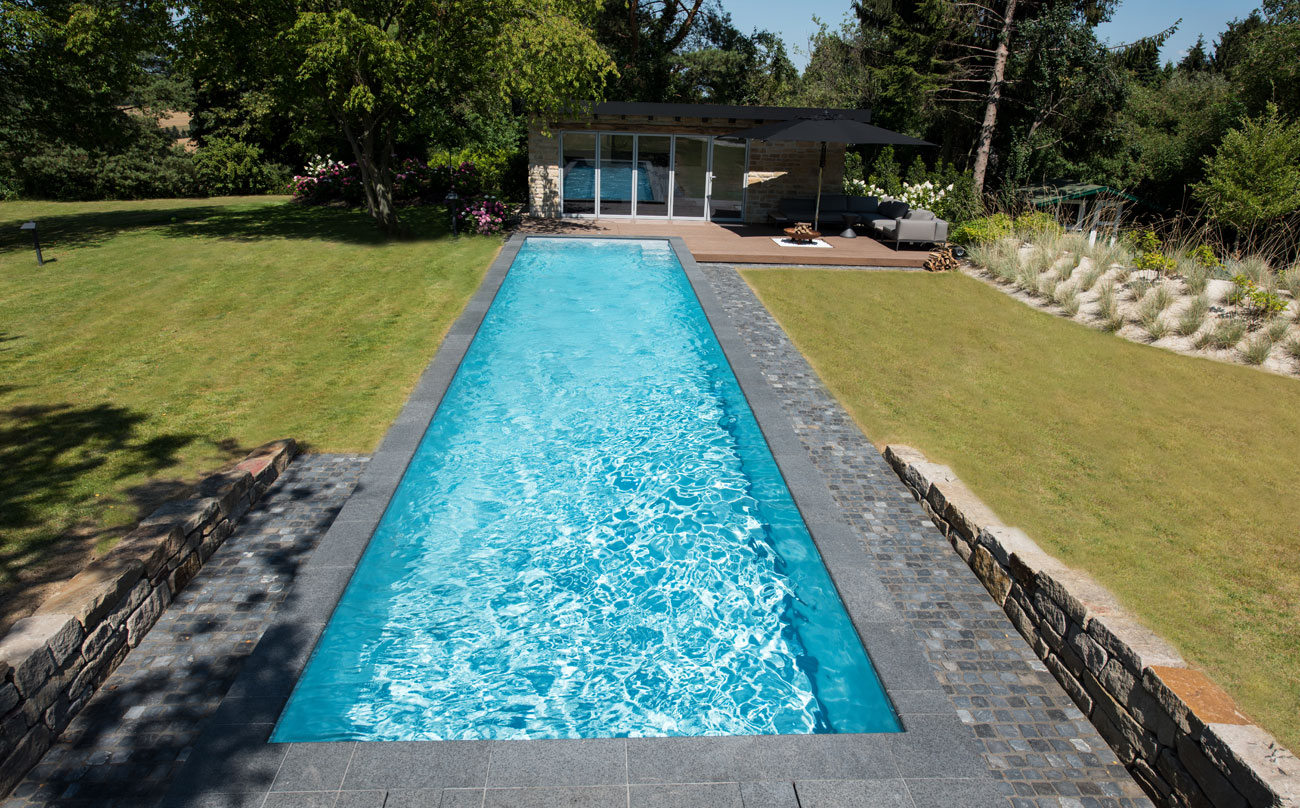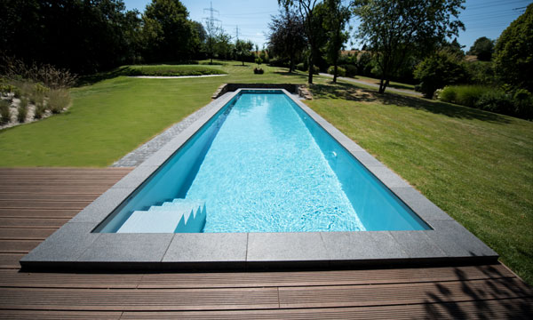Fertiges Schwimmbecken mit Blick vom Garten in Richtung Einstiegstreppe. Der angrenzende Wellnessbereich über dem Technikraum rundet das Gesamtprojekt harmonisch ab.