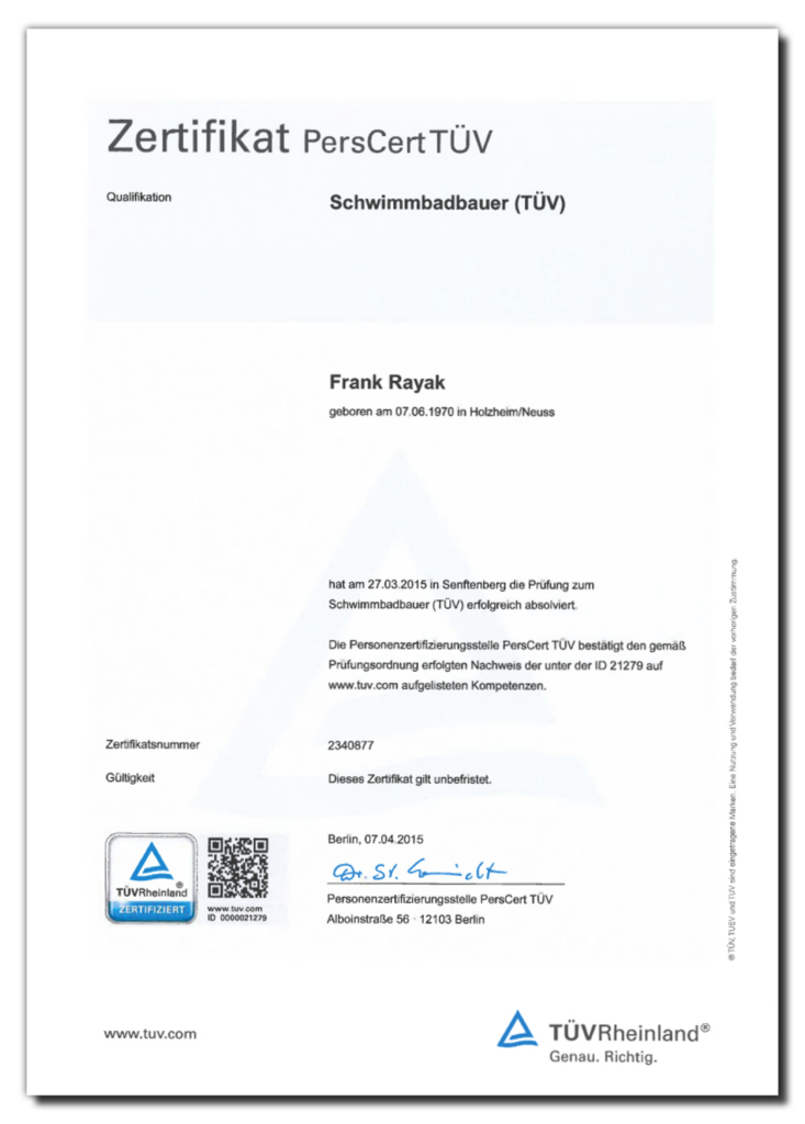 Fachkompetenz mit TÜV Zertifikat. Von der Planung bis zur Fertigstellung Ihres Schwimmbeckens erhalten Sie